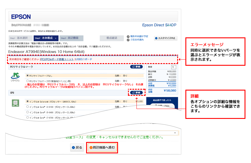 同時に選べない項目を選択した場合、ページ上部にエラーメッセージが表示されますので、選択可能な構成に選びなおしてください。