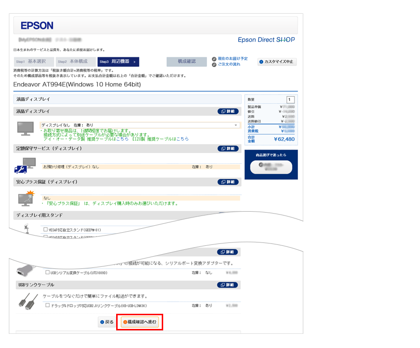 「STEP3 周辺機器」ページでは、液晶ディスプレイや外付けUSB機器などの周辺機器をお選びいただけます。