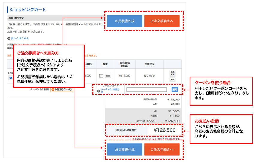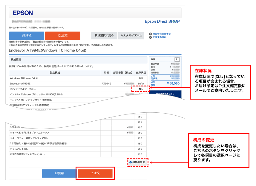 構成の確認が完了したら「お見積」または「ご注文」をクリックします。