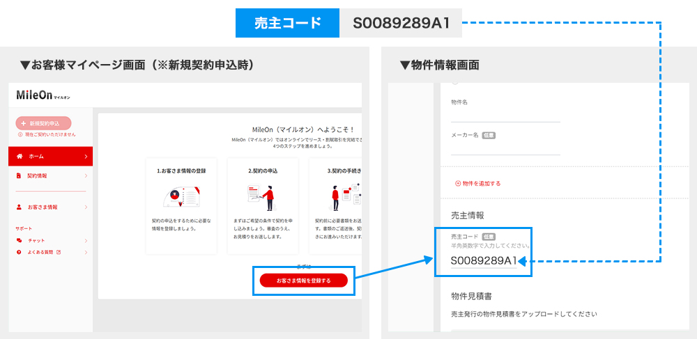 - 新規登録を行った後、お客様マイページにて「物件情報」画面の「売主コード」欄に以下コード「S0089289A1」(10桁半角英数字)をご入力ください。