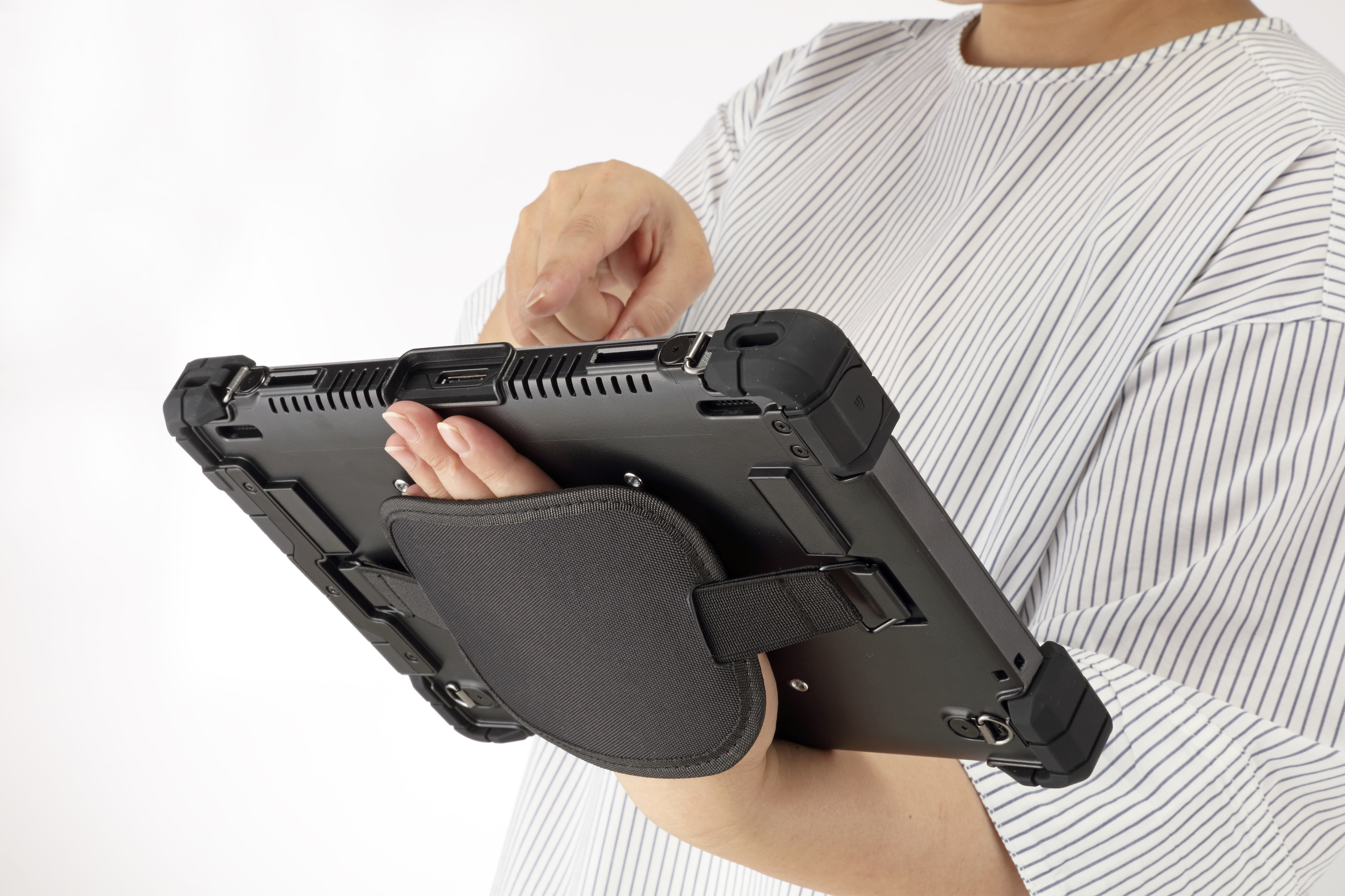 またハンドホルダーやショルダーベルト、VESA対応の自立スタンドや壁掛け金具など、各種オプションの取り付けも可能になり、活用のスタイルが広がります。ドッキングユニットや充電クレードル、2in1キーボードなどの周辺機器を組み合わせて、検品作業や事務処理など多様な業務にも柔軟な対応が可能です。
